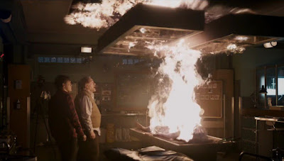 For the rest of the run-time, Tommy is repeatedly injured, like an aging bull repeatedly speared by the matador before it delivers the final, killing blow. Frustrated, he and Austin return to the autopsy theater. Incensed, they try to burn Jane; everything burns but Jane. Trapped, they put out the flames and decide to continue the examination. Maybe they can find out how she died (as though this will help them get out of their predicament). Her narrow waist suggests a corset. Her injuries suggest methods of repeated torture. She was a Salem witch, or so they think.