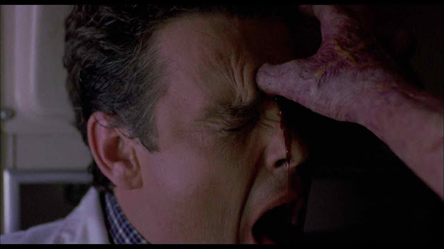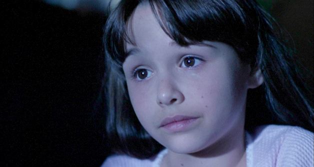 Let me just say that Michael is one strong son-of-a-bitch. Not satisfied with poking someone in the eye, he instead jambs his thumb through the unlucky man’s forehead. Cut to a young girl, perched on a couch. She’s the center of attention, here. Literally. The camera ever-so-slowly coasts towards her on a dolly. It’s almost imperceptible, like some of the dolly shots in Alien (1979). The scene, itself, is pure silhouettes, with the only light coming from the streetlights outside. Dwight H. Little and company really understand the look that made the original so evocative, and they shoot every scene for maximum effect. We’re given a portrait shot of Jamie’s face— glowing in the streetlights, while the shadows of raindrops run down her cheeks like tears. She has her uncle’s eyes, alright; they’re black as pitch.