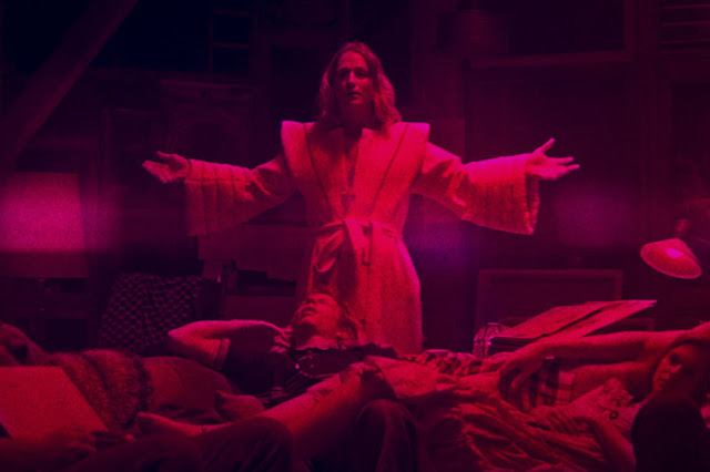 Mandy is a fantasy tale of revenge that forces Cage into a largely mute role. The actor's somewhat constrained delivery assists the narrative versus hijacking it; the story is at once a fairy tale and a Western, with horror themes: an old gunslinger working a menial job must return to a life of violence after his wife is killed. To do so, he must also return to drinking and meeting with old, bellicose friends. His bloody quest is two-fold, the villain tucked away in a tower, guarded by parallel agents who swear fealty to no one and delight in mayhem. They cannot be killed; Cage encounters them, first, only to learn what they are, later. These skirmishes feel parallel to the villain, Jeremiah Sand. The bikers push Cage towards Sand, similar to how Eric Draven is led towards Top Dollar by T-Bird and his pals.