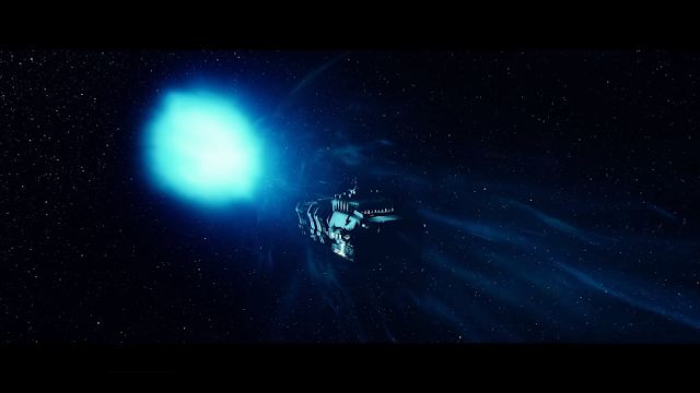 Still, Hope pushes forward, determined to reach her goal. She is boarded by a fellow, unsuspecting castaway. She subdues him with glee, holding the decrepit parasite over his face (action is not this movie's strong suit). While Hope waits, she continues her drawings, something of a governess; like Jane Eyre, she is handy with a quill. The artwork, the narrations—these allude to "The Crossing" prologue, for Alien: Covenant (2017). So does the shot when Hope emerges, walking from the background into focus.