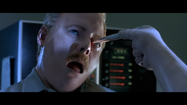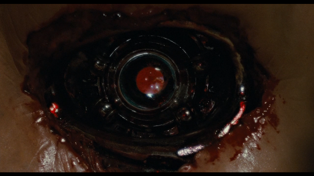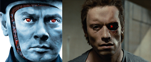 Cameron populates his world with standard Gothic fare: the animated miniature or statue. Centuries prior, these would have been Horace Walpole's subjects, literally walking out of their own paintings; or, suits of armor walking around, without a human body inside. In The Terminator, the likeness of a human is grafted into a walking suit of armor ("Inside, it's a hyper-alloy combat chassis—micro-processor-controlled, fully-armored, very tough..."). Another twist: these are simulacra (copies of non-existent objects: "I'm not stupid, you know? We can't make things like that yet!"). Given eyes of their own, they look back at us—at least, we think they do. What post-human horror lurks behind that carmine sphere?
