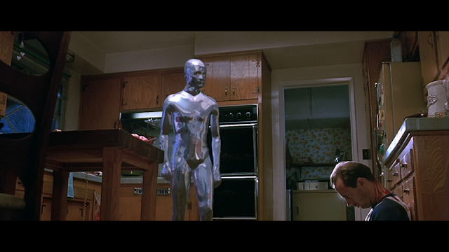 By constantly having the camera pointed at Luna, Miller always keeps his terminator in-frame. There's no off-screen space, nowhere for Luna to hide. Worse, without any shadows to conceal him, we can see everything about him, including the visual effect snafus. This last point is a major problem for me: Here is a creature meant to disguise itself as human. Yet, certain shots broach the Uncanny Valley by failing to digitally animate Luna's face! How ironic.