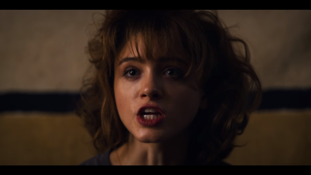 A blackout shuts down the movie, the entire mall, and all of Hawkins. Elsewhere, the shadow monsters makes its return(!). Then the power comes back on. The movie resumes, and the jump scare is coupled with a jump-cut. Nancy sits up, in bed; Jonathan sits up, next to her. She's late, and so is he. They dress in a rush, and she jumps out the window. Jonathan gears up for work and his mother sees him off (not before rubbing the lipstick off her son's cheek). He and Nancy drive past Dustin, whose mother is driving him home from camp.