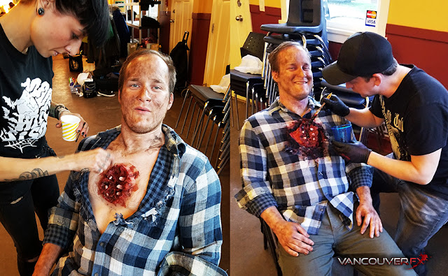 Dallas: I'm pretty used to creating gore and realistic dead bodies, so it doesn't really bother me much. The actor Calder Stewart (who played the Chestburster victim) was really great to work with. We had a lot of laughs during the prosthetic makeup application and getting him placed in the chamber, on set.