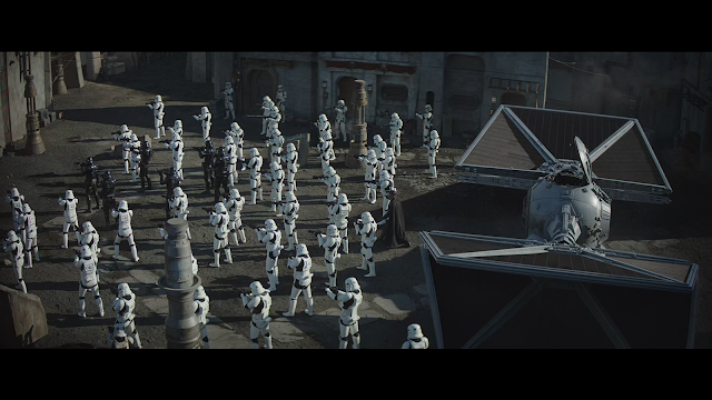 The part with IG-11 is a bit T2 (1991), and it's good fun. Cara bonds with Blondie, and Kuill suffers a sad end: death by storm troopers. Until this happens, the three amigos—Blondie, Greef and Cara—meet the Client in a bar. The Client speaks to his boss (surprise, surprise), standing smugly on the counter as a blue hologram. There's a lot of troopers, but before any of them can do anything the man on the hologram disappears in a hail of gunfire. The Client is killed, as are the troopers, leaving the gang stranded behind a row of overturned tables. There's a row of death troopers outside (they don't miss), backed by a platoon of the regulars.