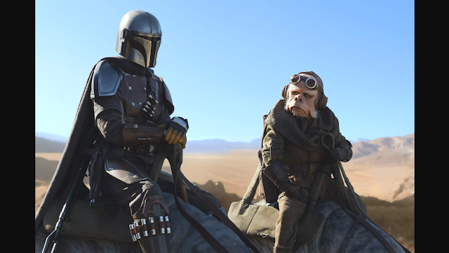 And moving forward, that's what The Madalorian succeeds in doing. Its photography is crisp and clear in ways even the restored footage from the originals could not hope to match. But there are numerous scenes that step backward into the past: masks, props, miniatures, rotoscoping—all the necessities of the 1970s. These are carefully revisited as a kind of exhibit that breathes life into the story. So does the music; the score by Ludwig Goransson is incredibly effective, sounding a bit like a cross between Bill Conti and Ennio Morricone. It's neither over- nor underused, placed at just the right moments.