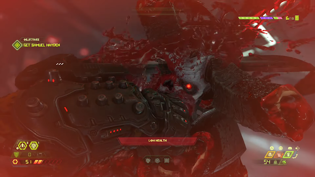 All of this occurs while including non-Doom elements into Doomguy's complex movement scheme. Doom Eternal marries older forms of gameplay like platforming and puzzle-solving to Doom's horizontal action formula. It's hardly classic Doom, in and of itself. However, the game also presents itself nakedly as a game. The health pick-ups and 1-ups glow bright colors, but also look like the assortment of collectibles seen on CRT monitors, back in 1993. Nostalgia as a marketable concept butts heads with player immersion— a more recent game design convention.