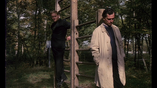 Next we're shown Bois Vieux, an old, stone homestead. Raymond is there with his family. His daughter opens a table drawer and screams at several spiders; her scream echoes. The son, husband and wife all scream too, but one at a time, listening to the echoes. They simper like fools. The scene seems pointless until Raymond innocently asks the gardener if there'd been any screams. In a quiet instant, the scene's true purpose becomes clear.