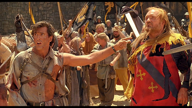 The feeling is also one of comradery—of relating to a man who, despite his faults, the jesters aspire to be. In the court of such a man, clowning becomes a form of worship, a fantasy of empowerment and assimilation. This assimilation may not pertain to Ash, himself, but his many luxuries. He's invincible, by all accounts impervious to the mayhem inflicted upon him. And he's adorned with all manner of wealth and pleasure: women, food, and self-fulfillment. He's the story's center, its quester no matter how inept. He saves the day, gets the girl(s), and becomes king. And yet, it's largely in his head—a head full of idiotic nonsense.