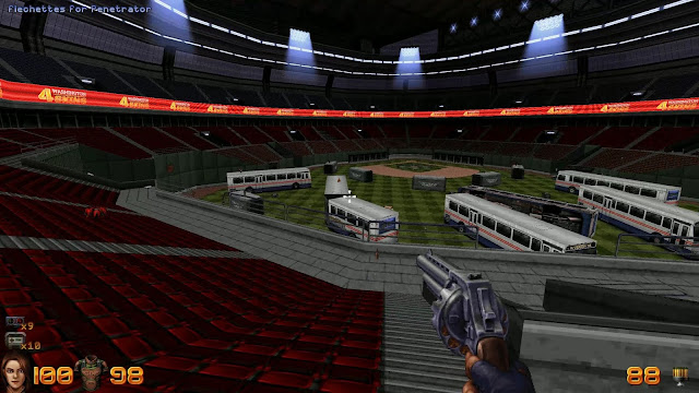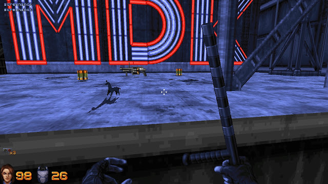 To quote the game itself, its sound design is "Not great, not terrible." The explosions look different than the tell-tale mushroom clouds from Duke Nukem or Blood. Those explosions, and the sound effects that accompanied them, had a ton of heft. Here, they're not bad by any means. There's just less oomph overall (especially because they don't damage the player, which feels strange). It kind of reminds me how the original sound effects in The Terminator (1984) were swapped with the modernized sound effects in later editions. Why change them?