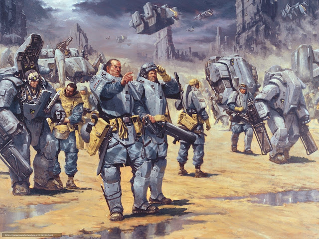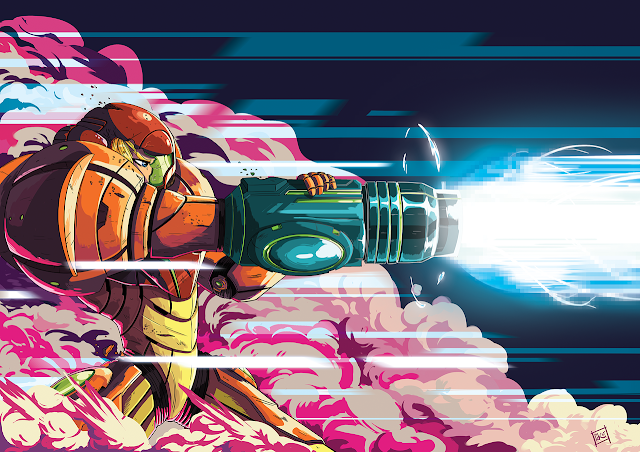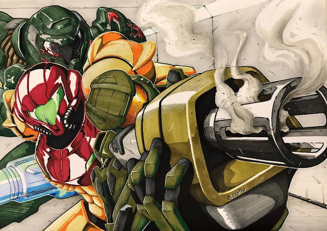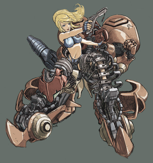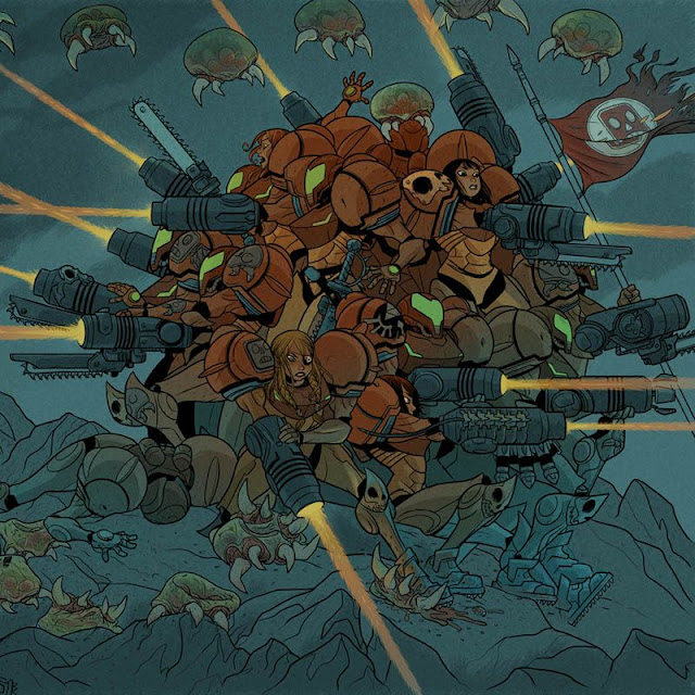 Consider this Metroid fan drawing by Matt SmithThe illustration depicts a battle scene, one where multiple Samus clones armed with Warhammer 40k weapons are hopelessly embroiled in a futile conflict against Metroid invaders (or defenders, depending on your point of view):