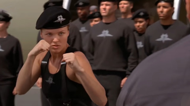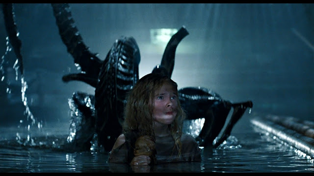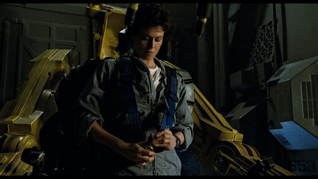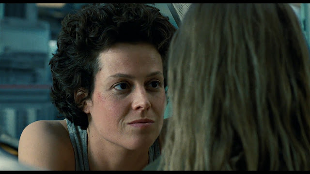 Then again, neither was Aliens. But both could sell war as a consumer good relatively guilt-free. Ignoring Ripley's emotional trauma for a moment, she returned to LV-426 in Aliens to renew a contract with the company. She reluctantly puts in the time, serving them (through her motivations) as the perfect killing machine fighting the perfect target. The closing fantasy is a clean break with the military altogether, with Ripley free to live a new life with Hicks and Newt.