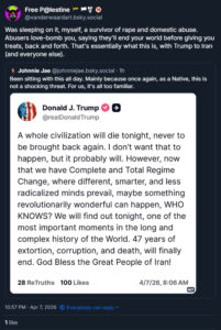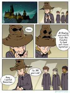 *E.g., my exes, Zeuhl and Lindsay (aka Jadis, below), defended Rowling—one being non-binary and the other genderfluid, both female in ways that embarrassed themselves, to different degrees. Those with oppression betray out of desperation; those with privilege, out of convenience; and there being no perfect abusers or victims, but for which betrayal (especially from token parties) is always embarrassing. Use that against capital and its defenders, however they manifest!