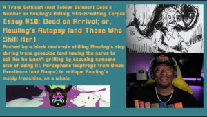For the Visually Impaired: I read this essay out loud on my YouTube channel ("Essay #10: Dead on Arrival; or, J.K. Rowling's Autopsy (and Those Who Shill Her)") and its short follow-up ("Essay #10.25: 'Don't Tag Me'; or, Th3Birdman Shows His Ass")