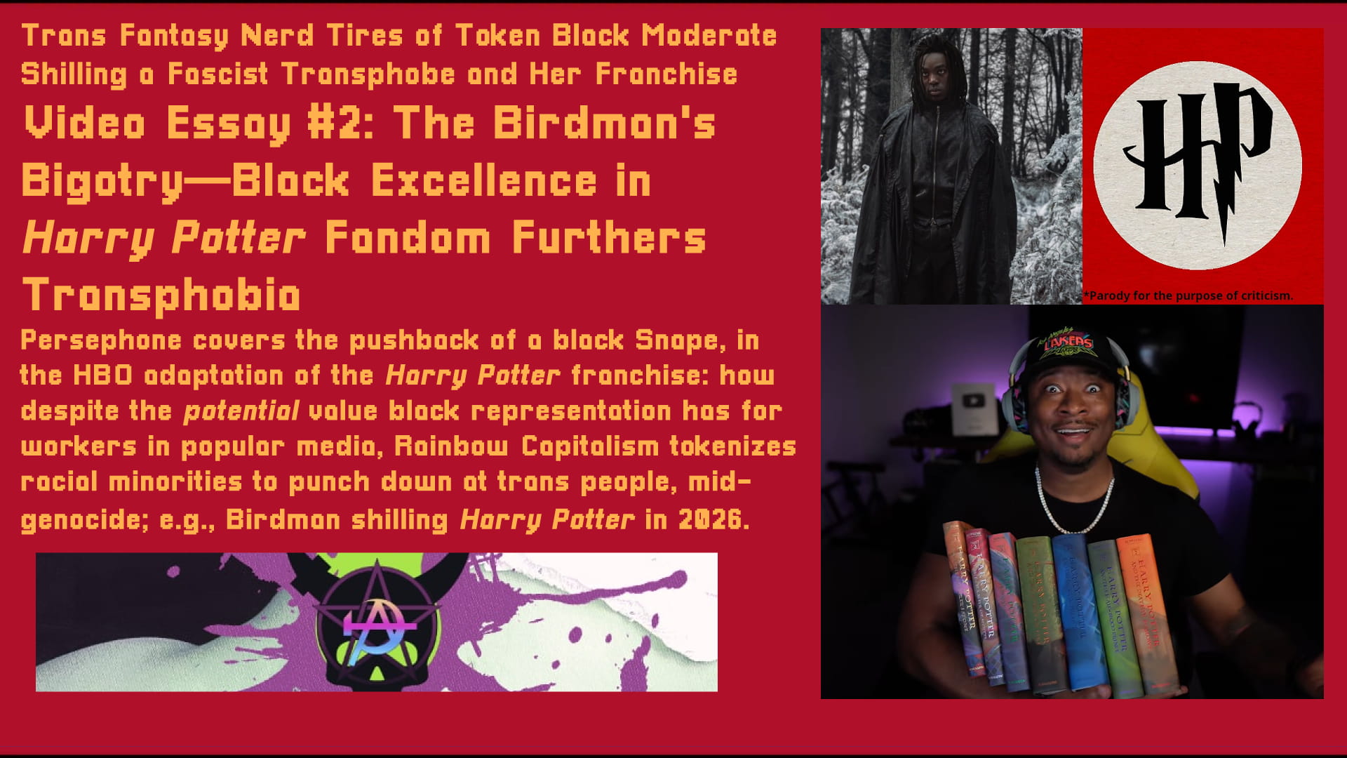 (source thumbnail: "Th3Birdman's Bigotry" vis-à-vis "Exposing the Grift: Harry Potter and the Curious Case of Black Snape," 2026)