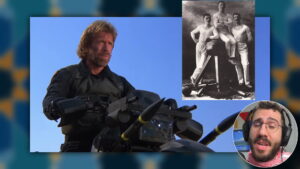 (exhibit 2b: Source, left: Yousef Abdul-Husain's "Yeah, This Chuck Norris Movie Is Anti-Arab Propaganda," 2026; top-right: Daniel Ziffer—cited: Murat C. Yıldız' "Muscular Judaism Alla Turca?" [2025]. Yıldız writes, "Jewish Studies scholarship treats Muscular Judaism and the obsession with the Jewish body as an exclusively central European phenomenon. It identifies Max Nordau, cofounder of the World Zionist Organization, as the creator of the concept of the 'muscular Jew.' Nordau's idea of Muscular Judaism established connections between this new type of Jew, the muscular Jew, who was physically and morally strong, and a prosperous Jewish nation" [ibid.]. Such notions don't have to exist purely among actual Jewish people [ethnic and/or religious] but mercenaries on and offstage who take state pay to further global US hegemony through a proxy state [re: Chuck Norris taking American-Israel funds to make a terrible Zionist action movie, above]. The same basic monomyth, "get strong, have revenge" idea is prevalent in many European and American fantasies [where capital uses these ideas to maintain Capitalist Realism, furthering state vampirism through "heroic" bodies tied to eugenics and phrenology aka race science; re: the Olympics and Nazi dogma concerning transphobia in the world of sports/neoliberal nation pastiche, wherein states make "freaks" ostensibly in labs to promote their arbitrary and maximalist, wheat-from-the-chaff cultural values*; see: "React #31: All Trans People Deserve Empathy - Responding to Brian Sutterer's Blatant Transmedicalism," 2026].