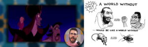 (exhibit 2: Source, left: Yousef Abdul-Husain's "Every Offensive Arab Stereotype in Aladdin," 2026; artist, right: A. Wyatt Mann [cited: Uffa Jensen's "The 'Happy Merchant' as an Antisemitic Hate Picture: a Historical Perspective on Visual Antisemitism," 2025].)