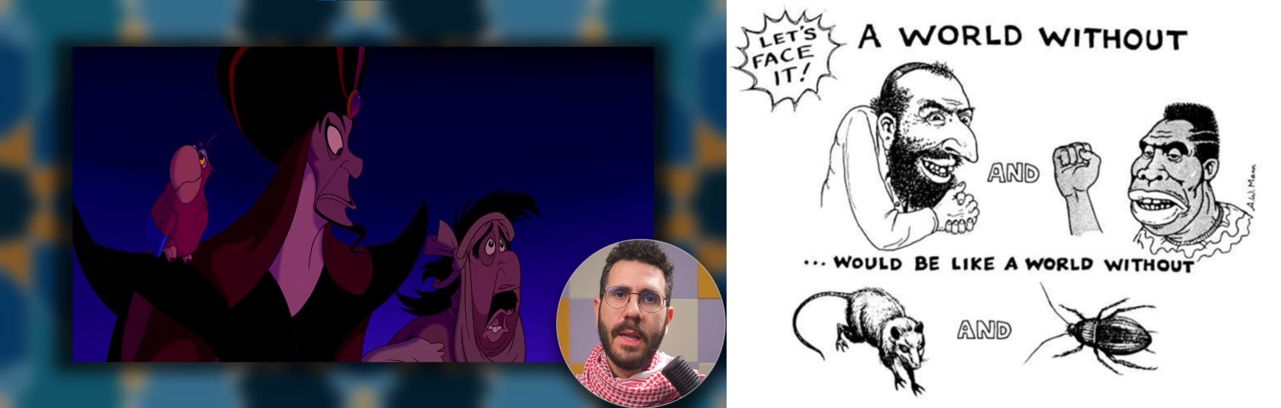 [17a] I.e., "Muscular Judaism," from Max Nordau (though I've also heard it called "heroic Jew" and takes on literal-to-cartoonish forms, above): "a term coined by Max Nordau in his speech at the Second Zionist Congress held in Basel on August 28, 1898. In his speech, he spoke about the need to design the 'new Jew' and reject the 'old Jew,' with the mental and physical strength to achieve the goals of Zionism" (source: Wikipedia). Israel loves to play the hero and the victim (the DARVO/obscurantism approach to Umberto Eco's "the enemy is weak and strong" adage), and some people can see through that, some can't; e.g. Einstein and Michael Brooks versus, say, Howard Zinn (re: "The Roots of Trauma" [2024], footnote 15). In a gradual shift under global American hegemony (and CIA interference), antisemitic tropes became increasingly Orientalist, including in Disney films into the '90s and beyond; i.e., replacing the nationalist (or American Zionist) Jew with the big-nosed, swarthy and duplicitous Arab (or brown people, in general; e.g., Mexican immigrants and asylum seekers from the Global South at large) inside the same scapegoat caricature (re: "Mild Criticism for an Arab Ally Who Loves/Hates Aladdin," below). Just as tokens emulate the white straight colonizer to survive, they abject their policed qualities—specifically the giving of violence regarding said qualities—onto other outsider groups. The diasporic Jews of the Third Reich (and spotty treatment in Soviet Russia*) became Americanized: a rabid token dog to seek out the same caricature in Arabs for Americans as they (or their ancestors) had once experienced, themselves; i.e., bigotry is plastic, subject to the same imbricating-but-flexible qualities any "dark" persecution language (and cop/victim outcome) does under capital as a white-supremacist institution promising assimilation to tin soldiers of all walks. They can be camped, but that camp exists in duality with canonical (or reactionary/separatist) forms that monopolize oppression for themselves (often corporate, below).