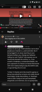 Me: Please; it's not to get YOUR attention, but to show people your channel; i.e., point-and-click. But if being tagged in an essay reporting on your behavior bothers you, change your behavior. Calling my work "bullshit" only exposes you as reactionary beneath the surface; i.e., if you scratch a moderate, a conservative bleeds—the go-to approach of a fascist (or fascist-lite/fascist with more masks) being to play the DARVO card, a huge red flag all on its own.
