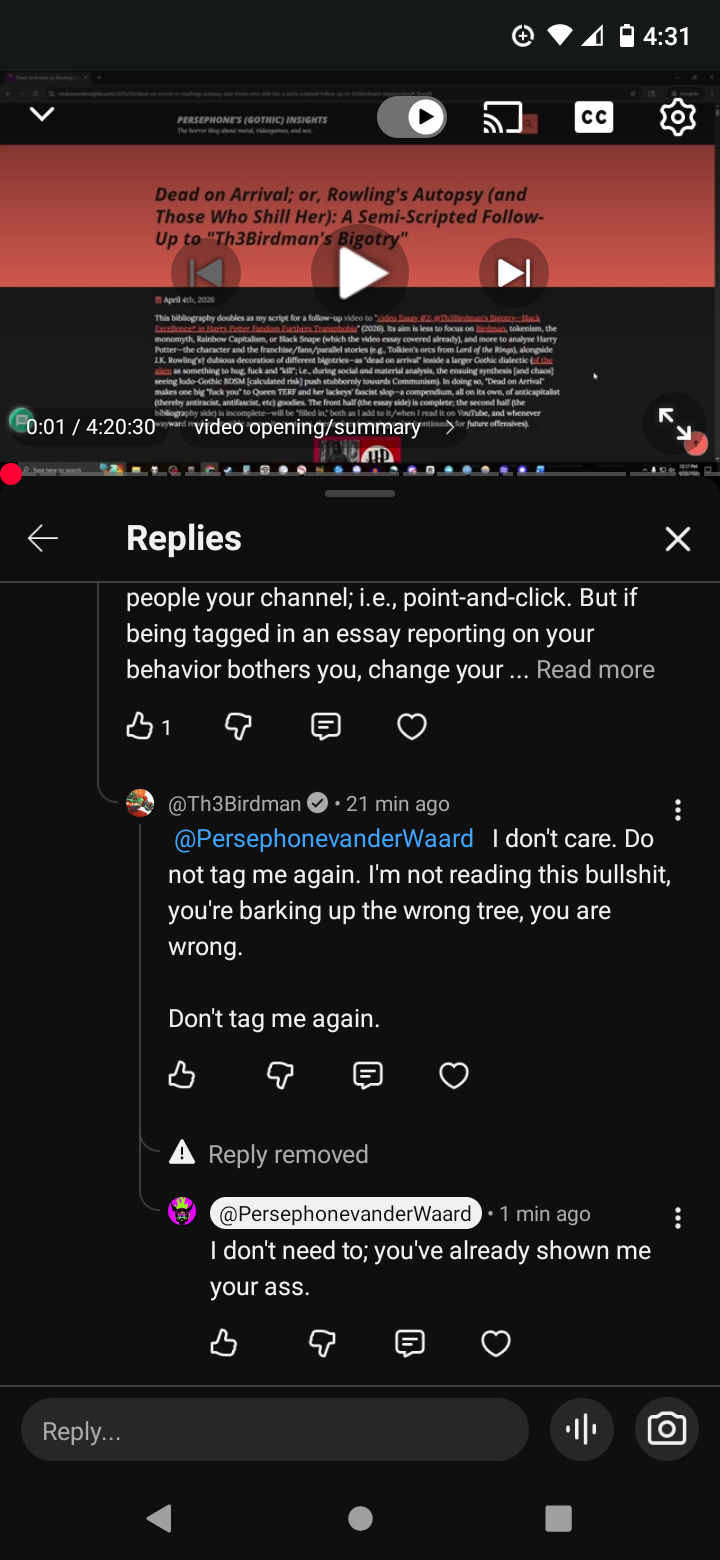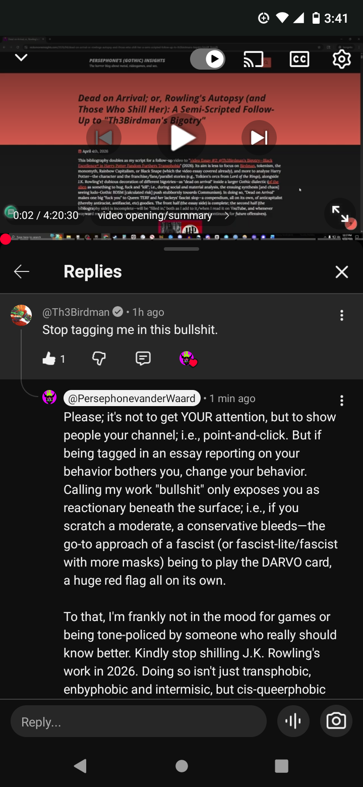 Me: I don't need to; you've already shown me your ass. Edit: Apparently you can't read three paragraphs, let alone a single sentence; re: "Kindly stop shilling J.K. Rowling's work in 2026." Gotta love someone who claps their hands over their ears while shouting "I'm not wrong!" during a genocide caused by the person whose work they're shilling, then making veiled threats to a recipient of said genocide: "Don't tag me again." Weird behavior, dude (source YouTube Community post: Persephone van der Waard, 4/14/2026).