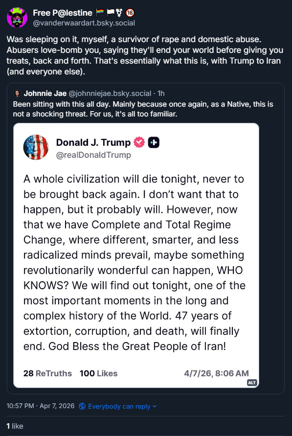 In that particular case, KCL explains how "it's not genocide unless you prove intent," and that it's just a "terrible tragedy" for people "who just happened to live in the 'wrong' part of the world" [ibid.]. So, "perfect victim arguments" by someone shedding crocodile tears. This leads me to respond, "On the receiving end of American Imperialism, you mean. That's not a tragedy at all; it's a war crime, my dear, and you're apologizing for state abuse of power. Because of course you are; you're a pro, and it's your job to" [source YouTube community post: 4/8/2026]. Looks like I was on the money when I wrote, "To be frank, KCL's a military girl giving off white liberal vibes, at times" [source: "YouTube Videos"]—a "Karen" who cares more about looking right/feeling superior than refusing to apologize for the American military: